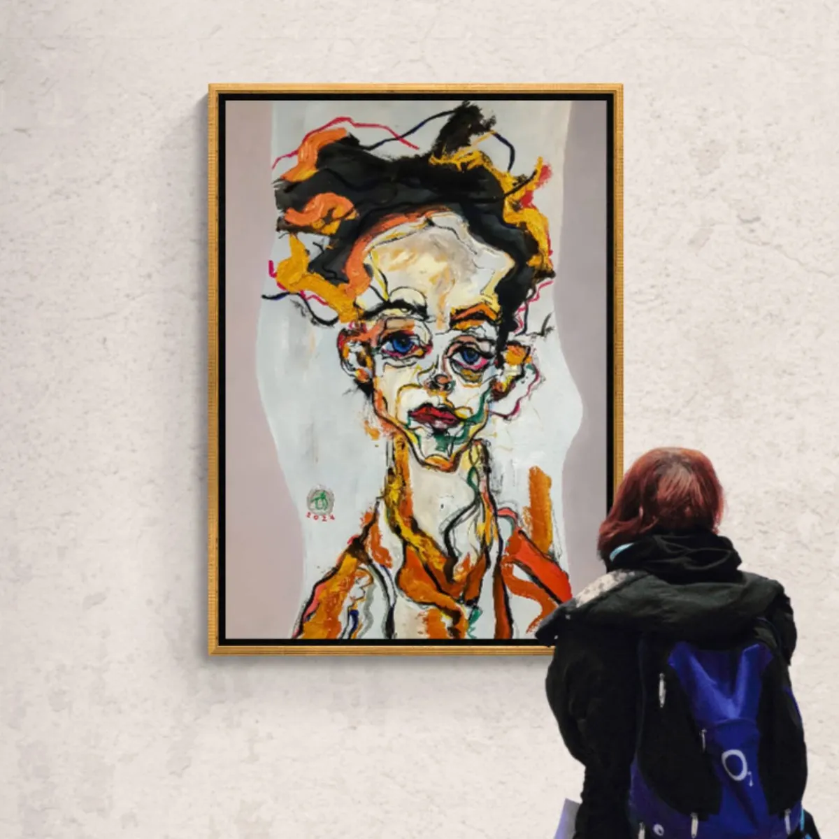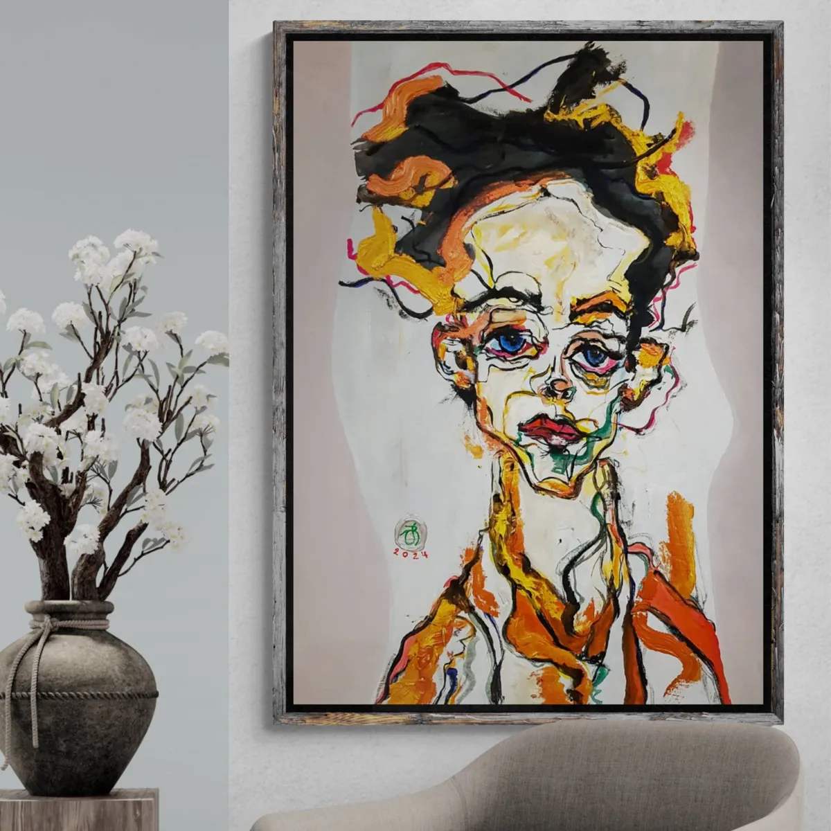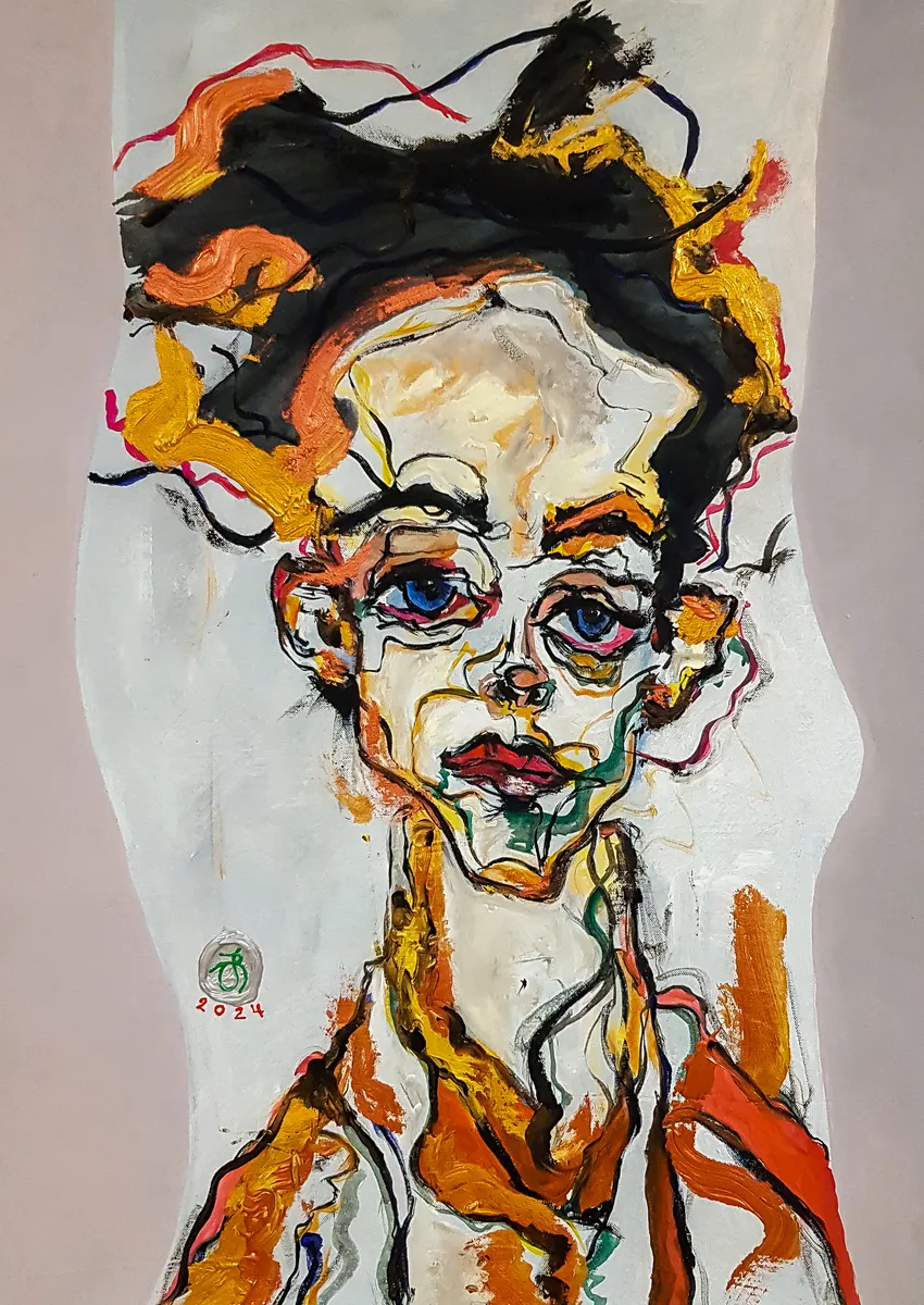 The painting features a figure portrayed with bold, dynamic brushstrokes and a vivid palette of colors. The artist has played with the form and proportion, which gives the painting an abstract and somewhat distorted quality, yet there's a clear emotion captured in the subject's eyes and the set of the mouth. The style might be indicative of a modern expressionist approach, emphasizing emotional expression over realism. It's an intriguing work that evokes a strong, reflective response in the viewer. 🎨🖌 P.S. – If you sensed a touch more poetry in the prose today, credit goes to my digital assistant, ChatGPT (affectionately known as DALL·E). While I bring color to canvas, DALL·E brings creativity to commentary—artificially intelligent, authentically artistic. 📝❤️