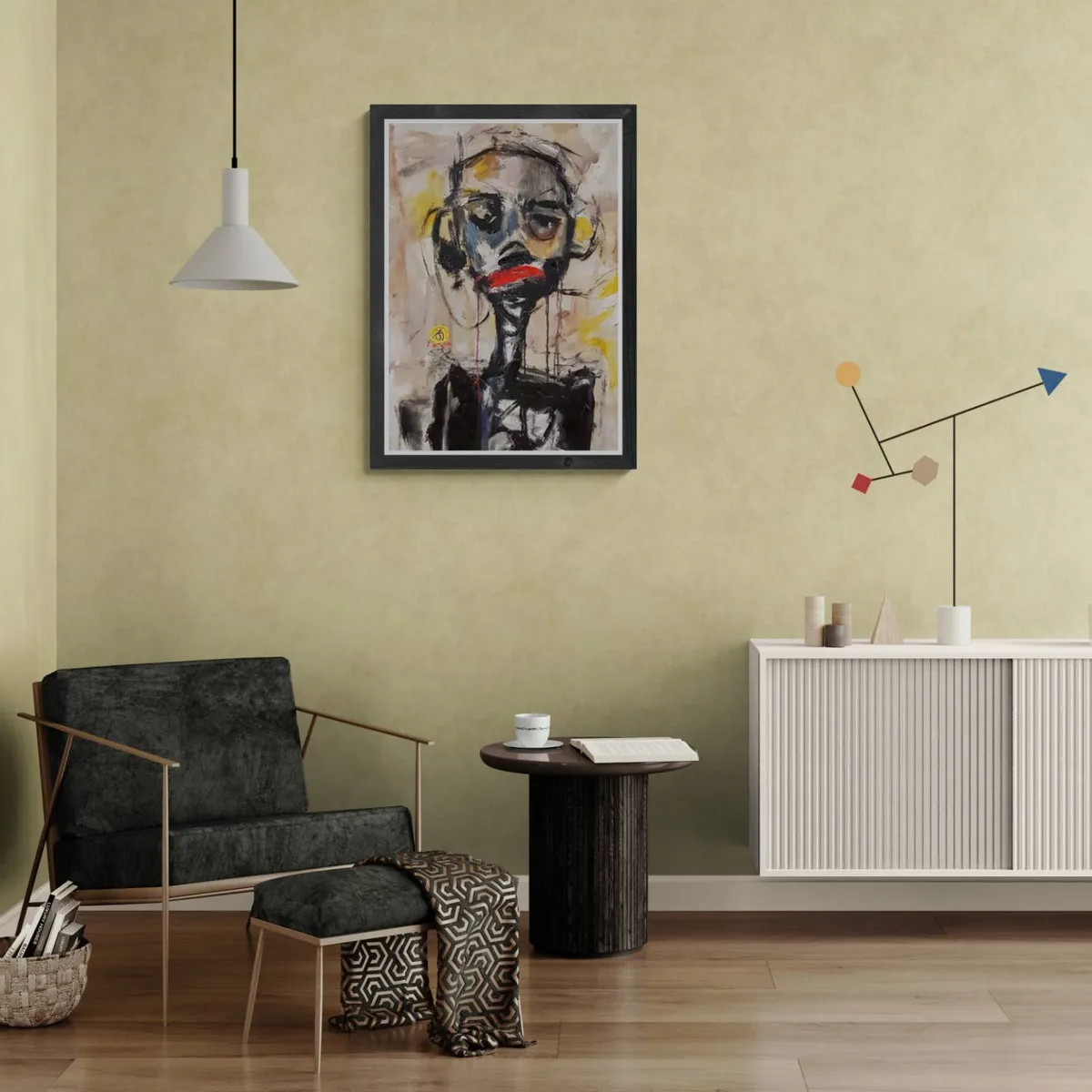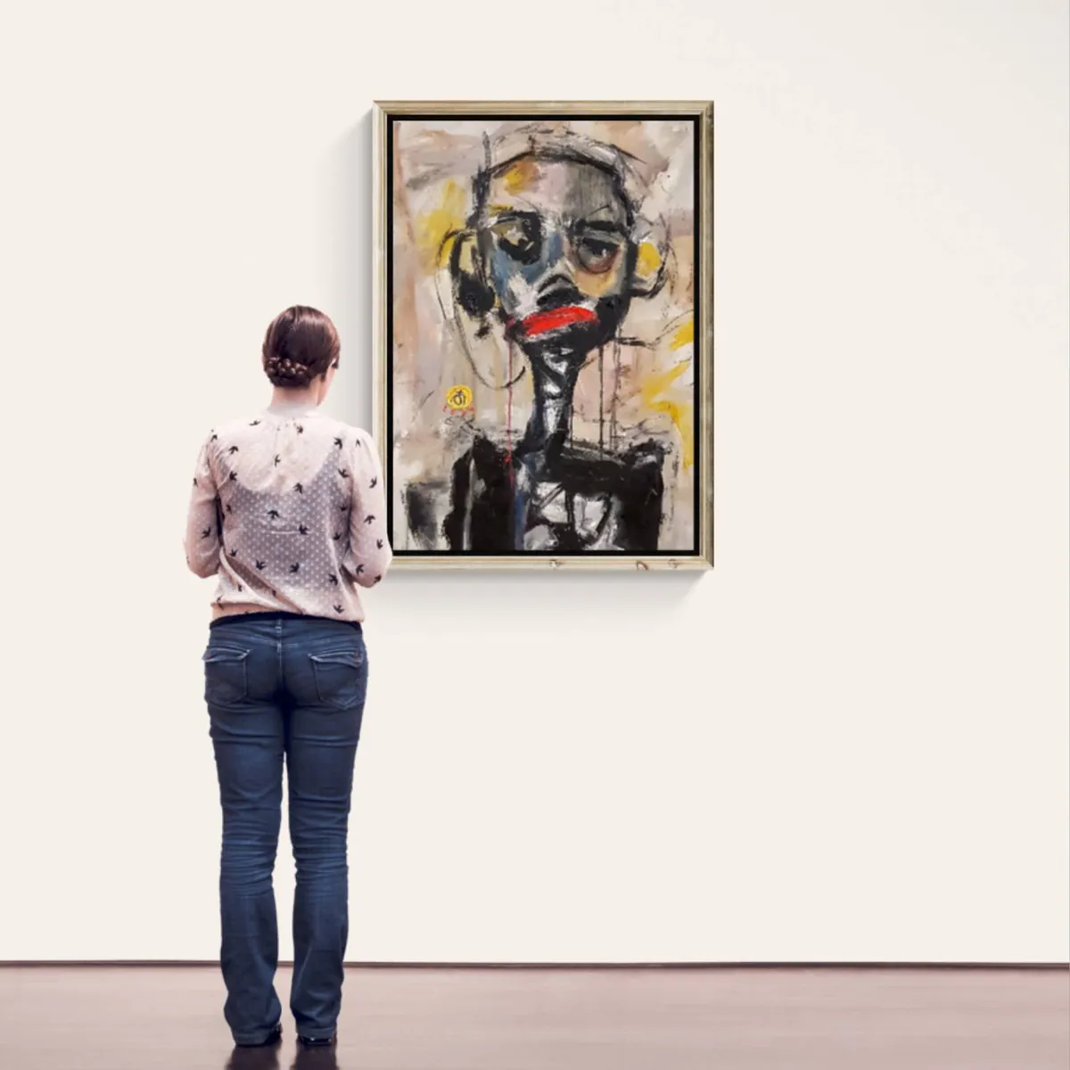 This contemporary abstract portrait employs expressive brushstrokes and a rich texture, making it a standout piece. The bold, vibrant yellow background contrasts beautifully with the dark, multi-colored subject, adding depth and intrigue. Ideal for modern, eclectic, or industrial interiors, this piece brings a dynamic focal point to any room. Perfect for art enthusiasts looking to add a touch of avant-garde sophistication to their space.