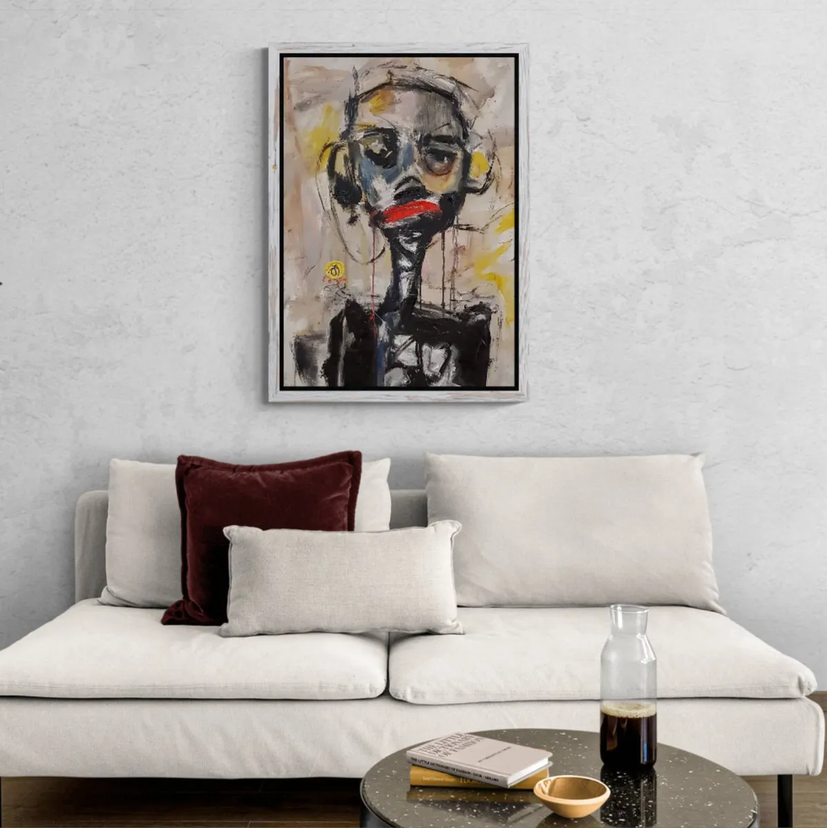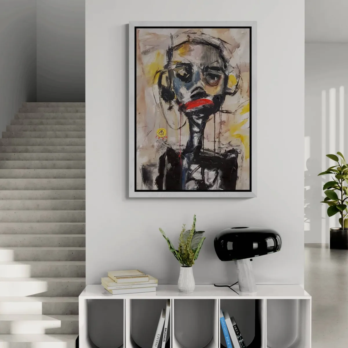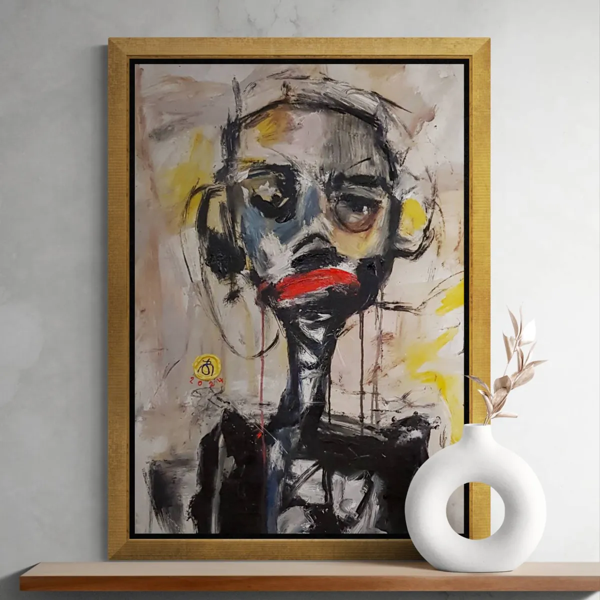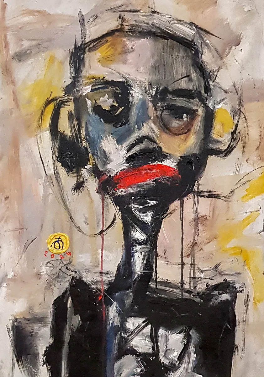 This "Character Portrait Painting" uses vivid colors and bold brushstrokes to convey raw emotion. The textured gray background contrasts with dynamic hues of white, black, red, yellow, and green, creating a powerful visual impact. The abstract style invites viewers to explore its emotional depth and intensity. Created in 2024, this piece will add a striking focal point to any interior. Its vibrant colors and dynamic composition make it a versatile addition to modern minimalist spaces or eclectic art-filled rooms, perfect for living rooms, offices, or galleries.