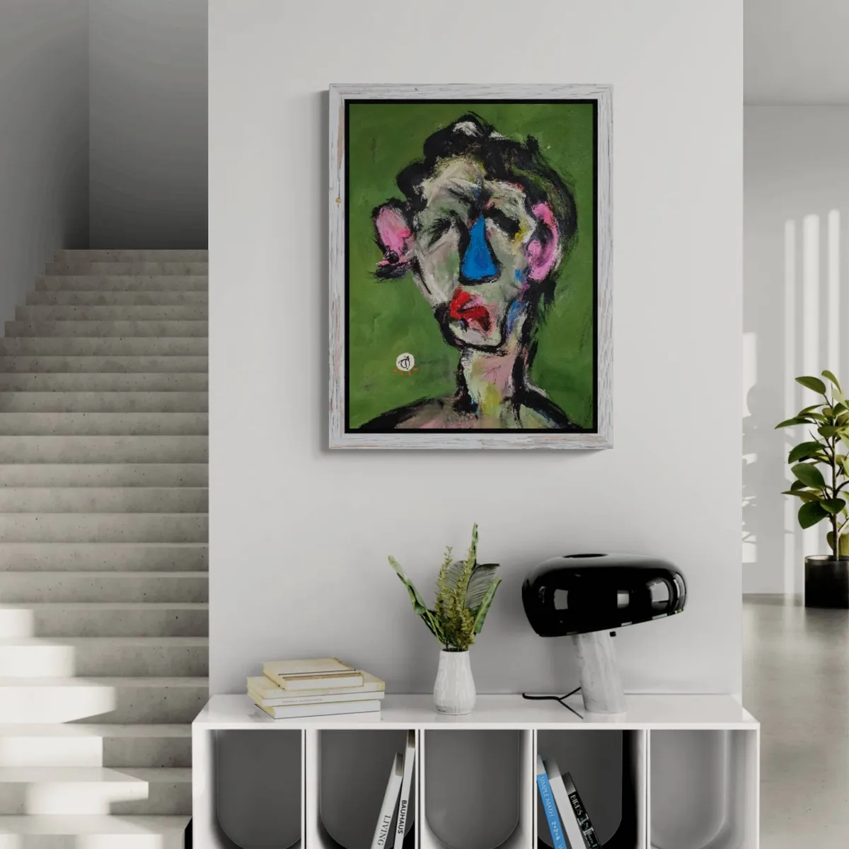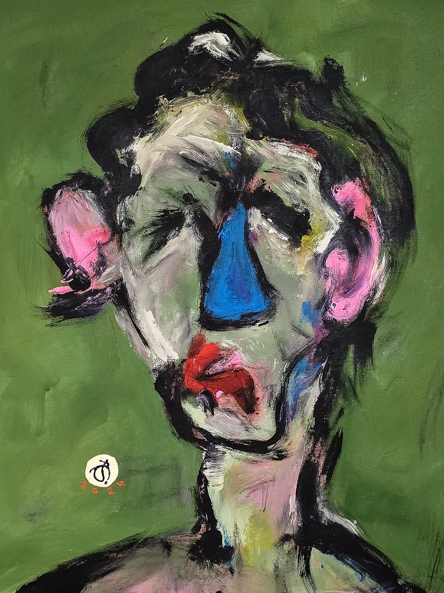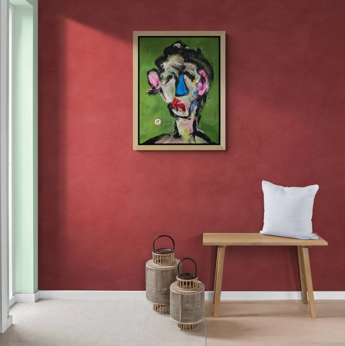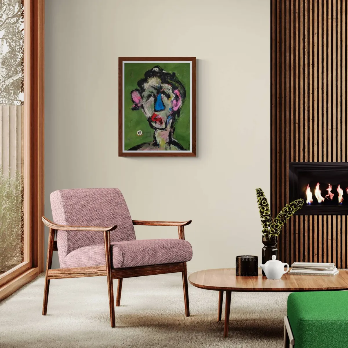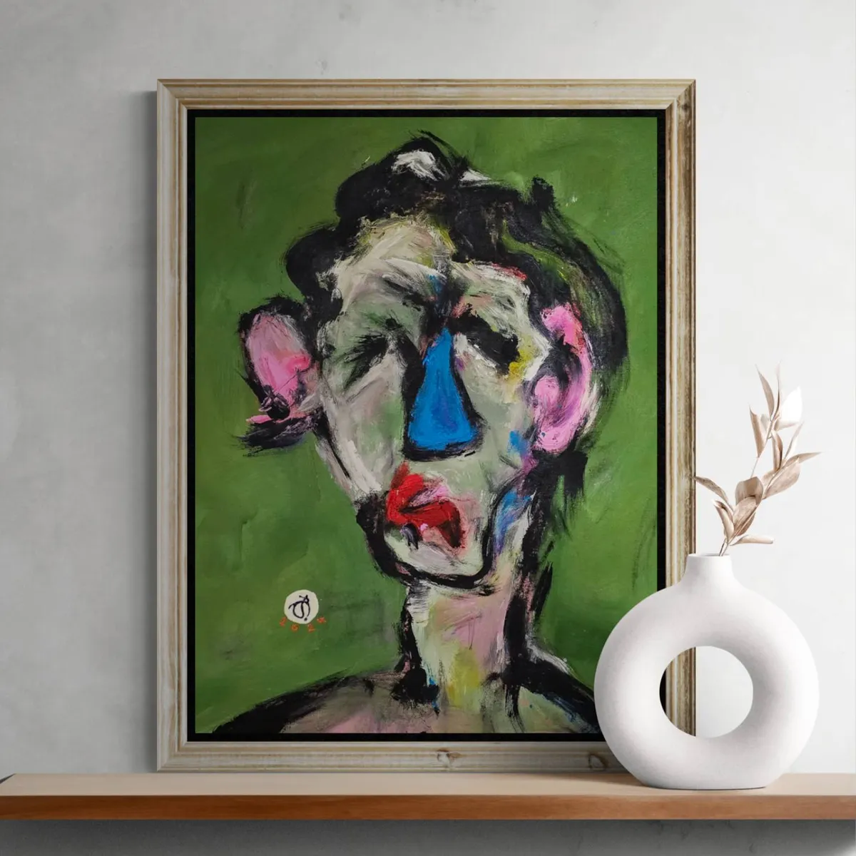 This abstract character portrait captures intense emotions through bold, chaotic brushstrokes. The face, distorted and vibrant, features blues, pinks, reds, blacks, and whites against a green background, creating a striking visual impact. The expressive style and vivid colors make this piece a dynamic addition to modern and contemporary interiors, adding a touch of emotional depth and artistic flair to any space.