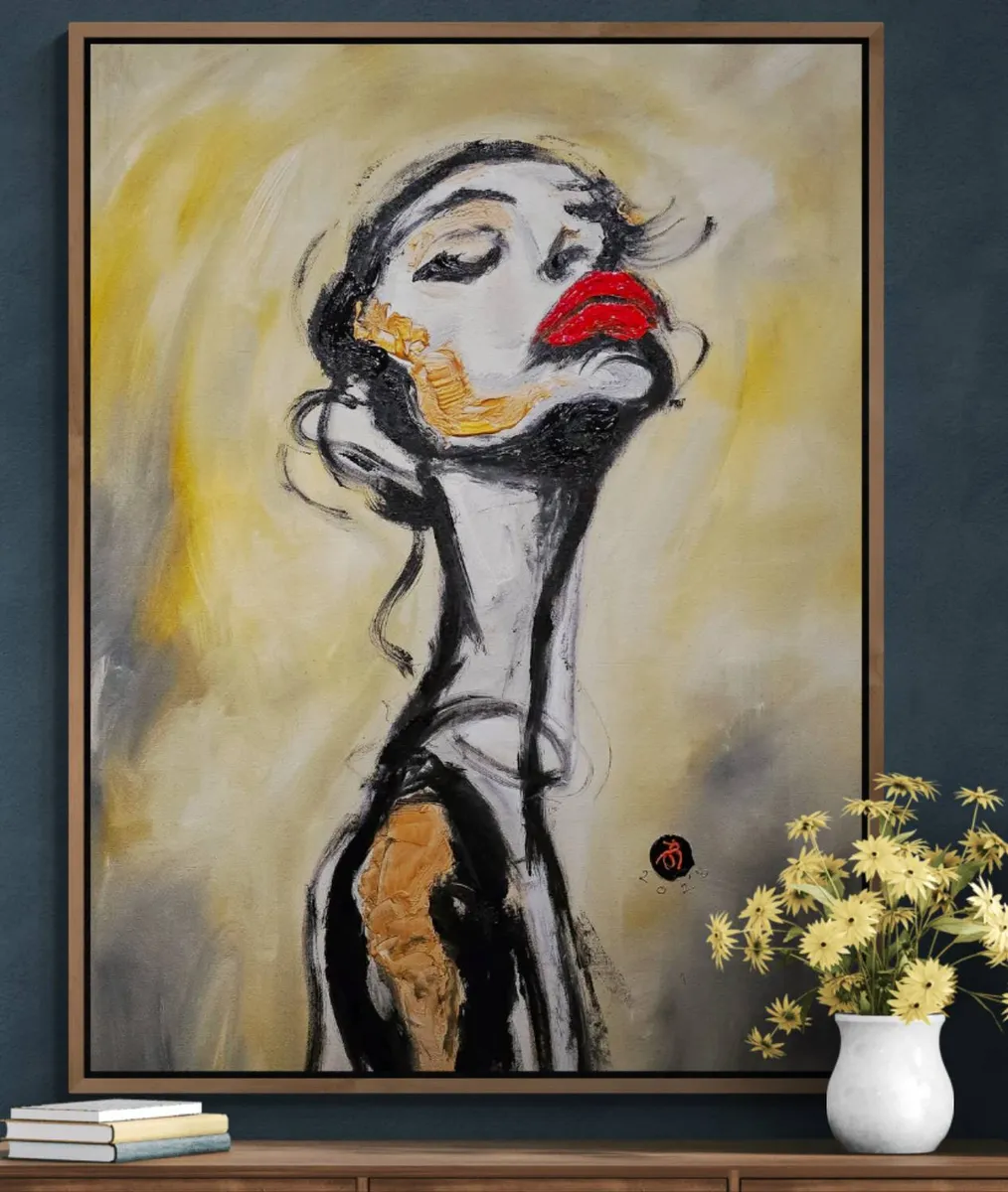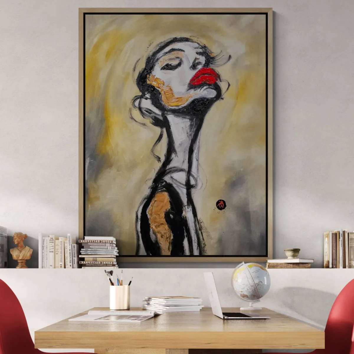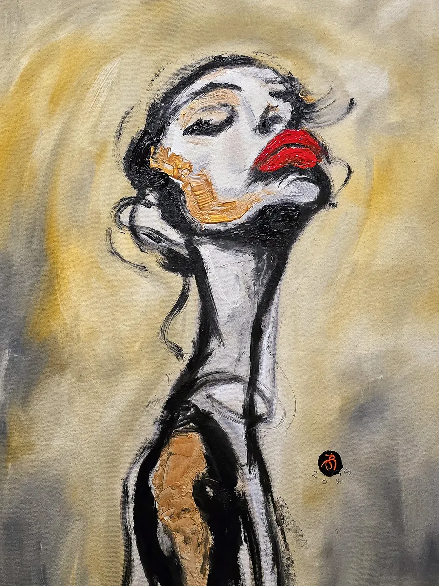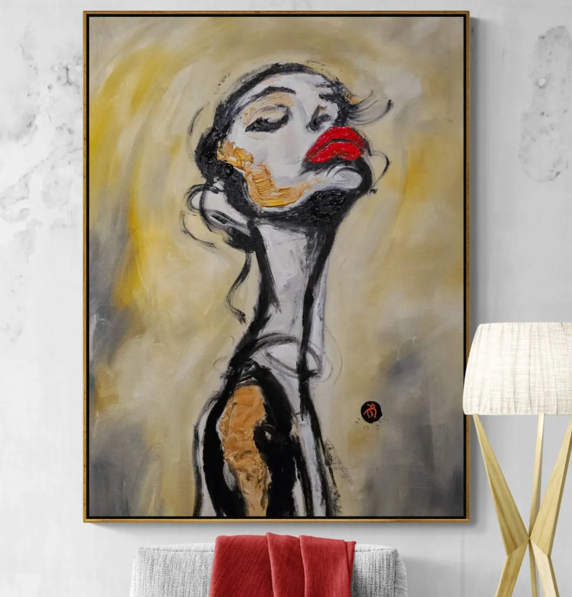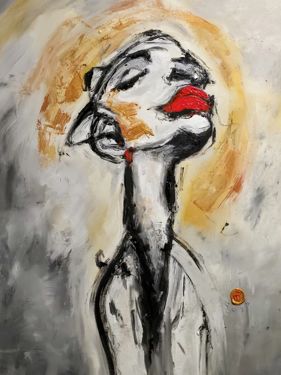 "Exalt" – Expressive Abstract Portrait by Retne A vision of elevation and surrender, "Exalt" captures the moment when the physical dissolves into something beyond. The elongated neck stretches towards an unseen force, the closed eyes suggesting both inner peace and defiance. The subject is suspended between serenity and intensity, with red lips acting as a focal point—a symbol of life, passion, or the remnants of an unspoken voice. The golden arc, a signature element in Retne’s work, encircles the figure like a halo, yet remains unfinished—a symbol of transformation rather than completion. Thick, textured strokes define the contours, blurring the lines between form and abstraction. The composition breathes movement, as if the figure is dissolving into light, leaving only an impression of grace, strength, and transcendence. A striking interplay of raw emotion and abstraction, this piece invites the viewer to interpret its presence in a personal way, making it a powerful statement piece in any contemporary art collection.
