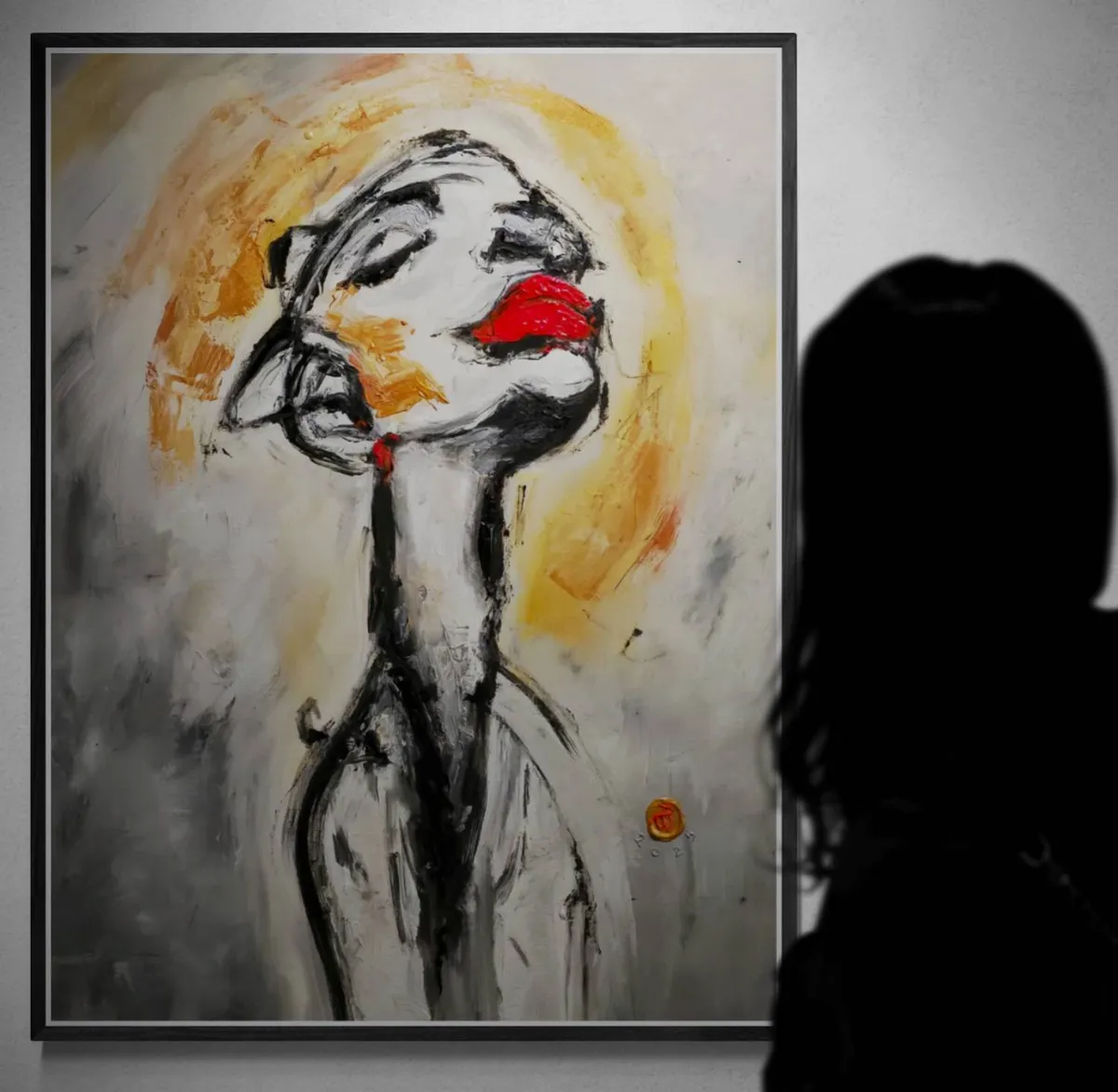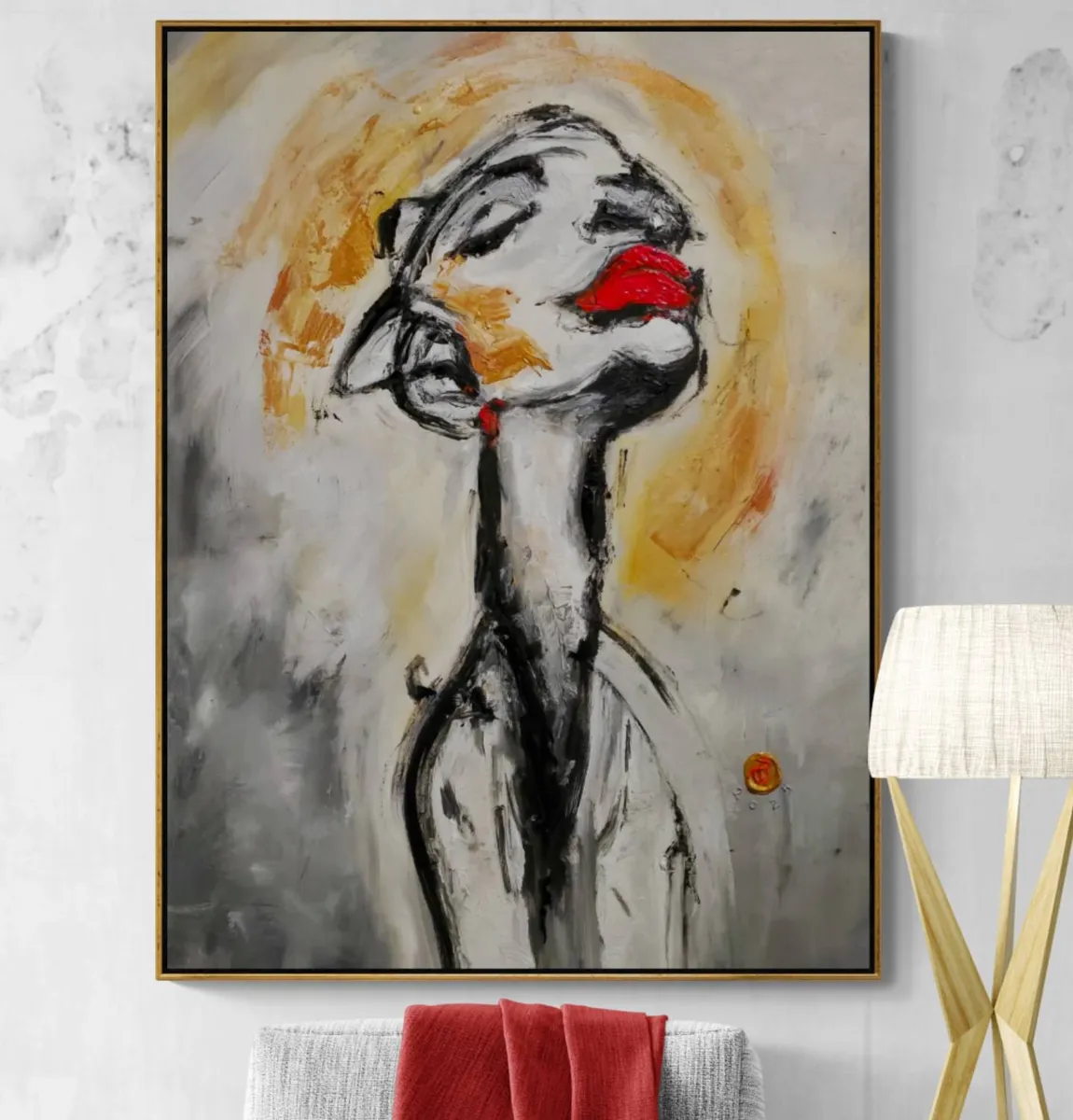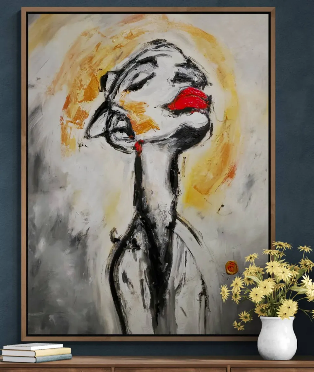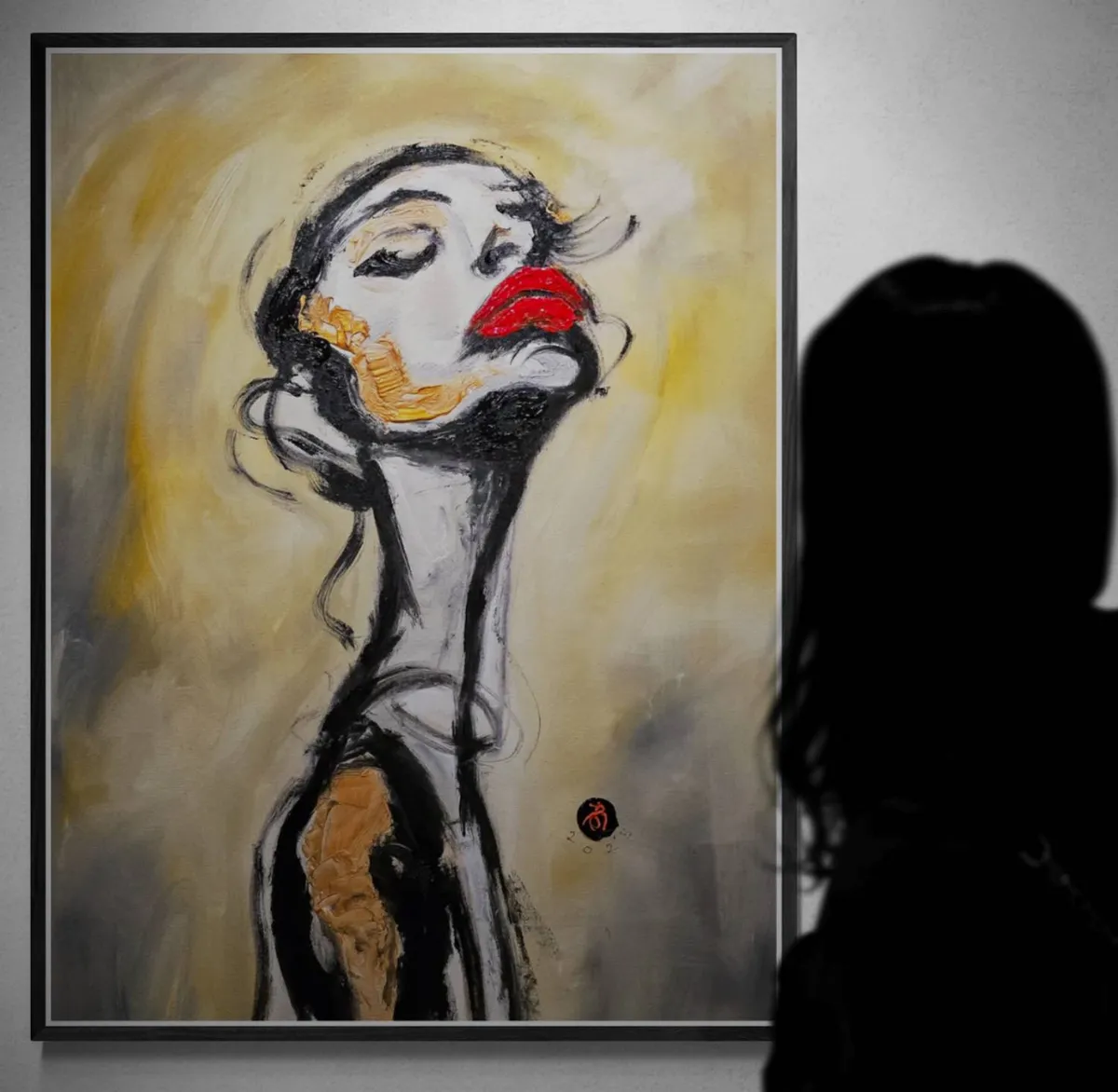 "Exalt" – Expressive Abstract Portrait by Retne A vision of elevation and surrender, "Exalt" captures the moment when the physical dissolves into something beyond. The elongated neck stretches towards an unseen force, the closed eyes suggesting both inner peace and defiance. The subject is suspended between serenity and intensity, with red lips acting as a focal point—a symbol of life, passion, or the remnants of an unspoken voice. The golden arc, a signature element in Retne’s work, encircles the figure like a halo, yet remains unfinished—a symbol of transformation rather than completion. Thick, textured strokes define the contours, blurring the lines between form and abstraction. The composition breathes movement, as if the figure is dissolving into light, leaving only an impression of grace, strength, and transcendence. A striking interplay of raw emotion and abstraction, this piece invites the viewer to interpret its presence in a personal way, making it a powerful statement piece in any contemporary art collection.