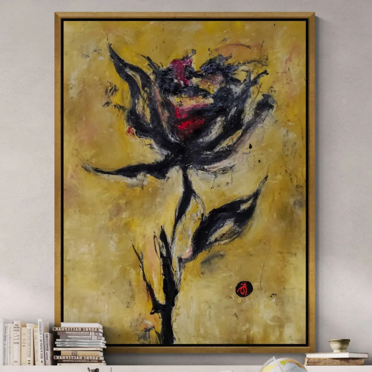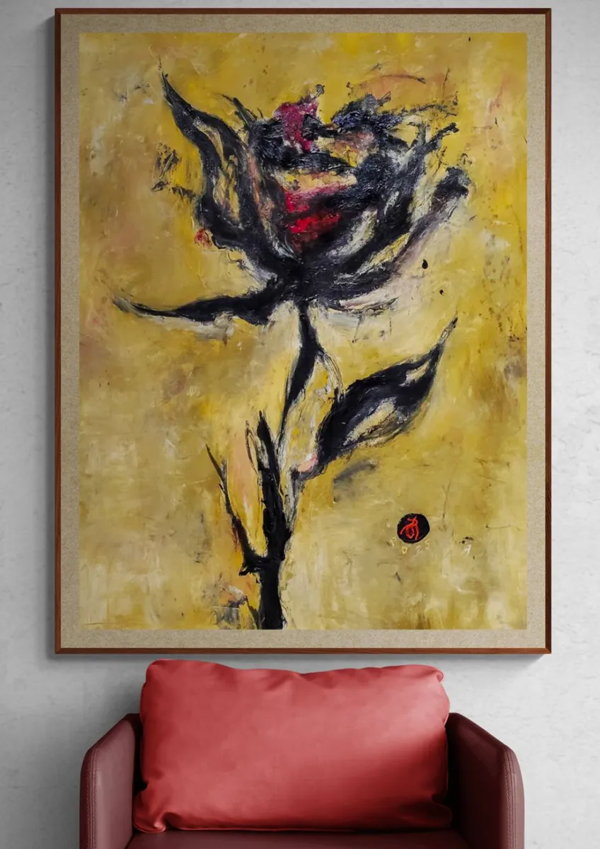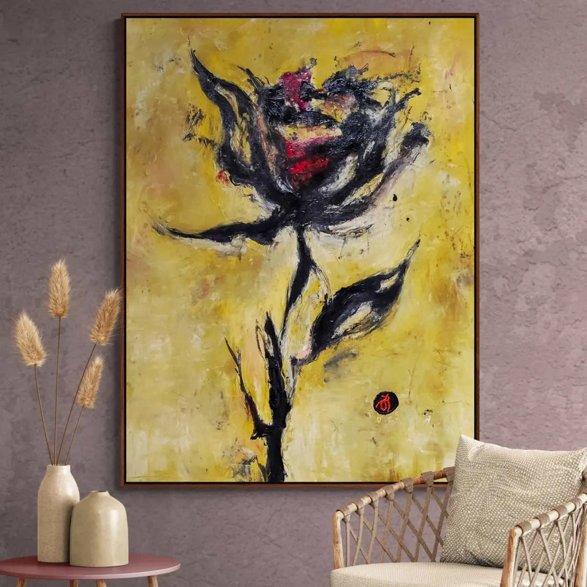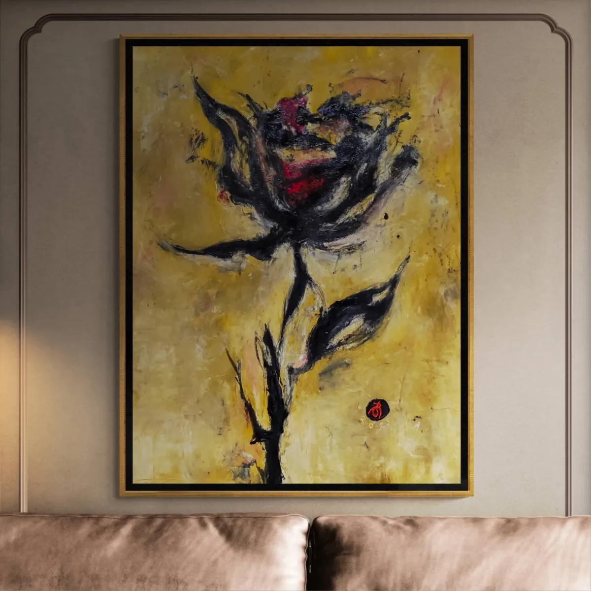 A bold, gestural interpretation of a single flower, where sweeping black strokes and textured layers rise against a golden field. The image balances between abstraction and suggestion, evoking both the fragility and resilience of nature. Each mark carries the energy of calligraphic movement, creating a composition that feels timeless and immediate. This work belongs to Retne’s series exploring expressive minimalism, where form emerges from the dialogue between gesture and space. To N-7 transforms the simplicity of a floral motif into a powerful contemporary statement. Signed on the front. On the back – titled, dated, and hand-signed by the artist. Certificate of Authenticity included and hand-signed – confirming originality and authorship. Technical Details Canvas size: 90×70 cm (5 cm margins for stretching) Recommended stretcher frame: 80×60 cm Medium: Acrylic and mixed media on canvas Finish: Sealed with UV Gloss Varnish (shiny finish) Canvas Edges & Composition 5 cm margins around the edges are painted to maintain full visual continuity when stretched. Strokes and textures wrap around the sides. Shipping & Packaging Courier Services: DPD, GLS, UPS, PostNL, FedEx, LP EXPRESS Packaging: Shipped rolled in a secure heavy-duty tube for safe international delivery Tracking: Provided Important: Please wait to order a stretcher frame until the artwork arrives to ensure precise fit.