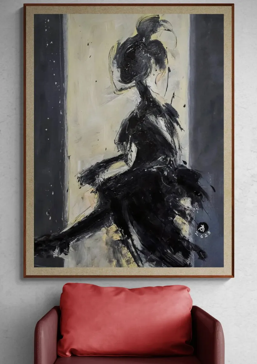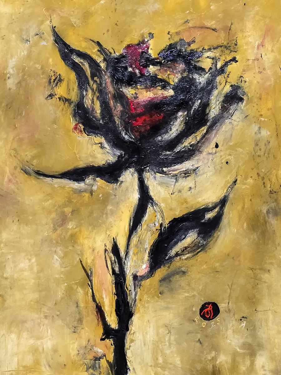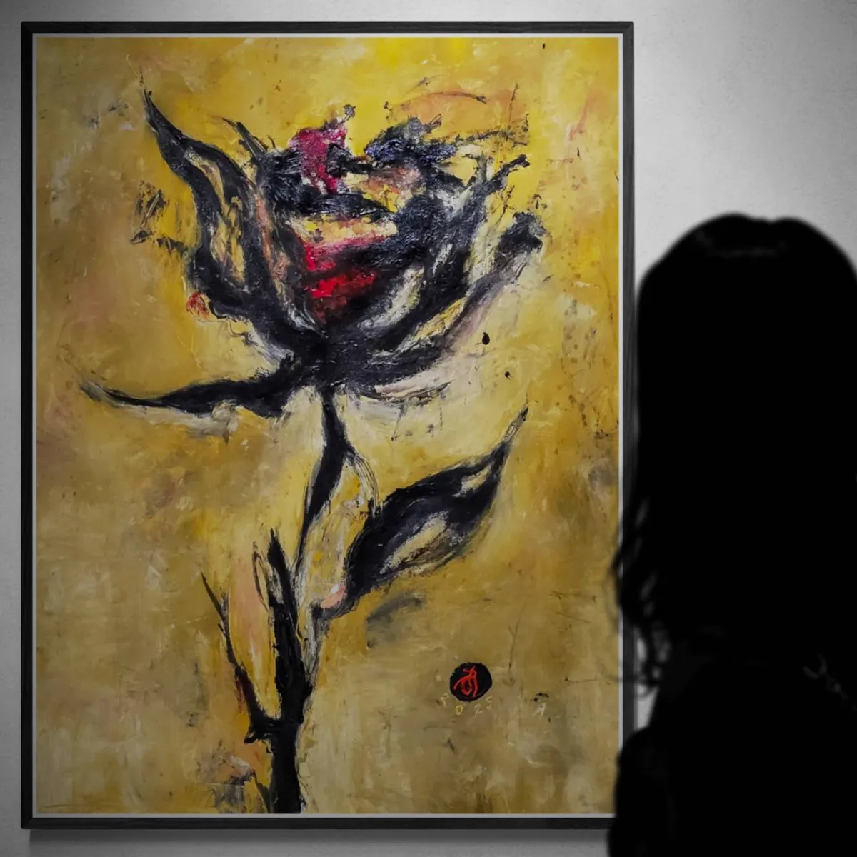 A bold, gestural interpretation of a single flower, where sweeping black strokes and textured layers rise against a golden field. The image balances between abstraction and suggestion, evoking both the fragility and resilience of nature. Each mark carries the energy of calligraphic movement, creating a composition that feels timeless and immediate. This work belongs to Retne’s series exploring expressive minimalism, where form emerges from the dialogue between gesture and space. To N-7 transforms the simplicity of a floral motif into a powerful contemporary statement. Signed on the front. On the back – titled, dated, and hand-signed by the artist. Certificate of Authenticity included and hand-signed – confirming originality and authorship. Technical Details Canvas size: 90×70 cm (5 cm margins for stretching) Recommended stretcher frame: 80×60 cm Medium: Acrylic and mixed media on canvas Finish: Sealed with UV Gloss Varnish (shiny finish) Canvas Edges & Composition 5 cm margins around the edges are painted to maintain full visual continuity when stretched. Strokes and textures wrap around the sides. Shipping & Packaging Courier Services: DPD, GLS, UPS, PostNL, FedEx, LP EXPRESS Packaging: Shipped rolled in a secure heavy-duty tube for safe international delivery Tracking: Provided Important: Please wait to order a stretcher frame until the artwork arrives to ensure precise fit.