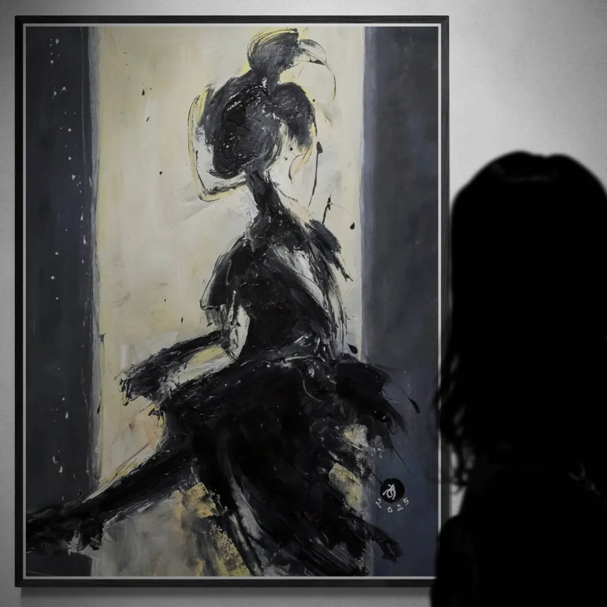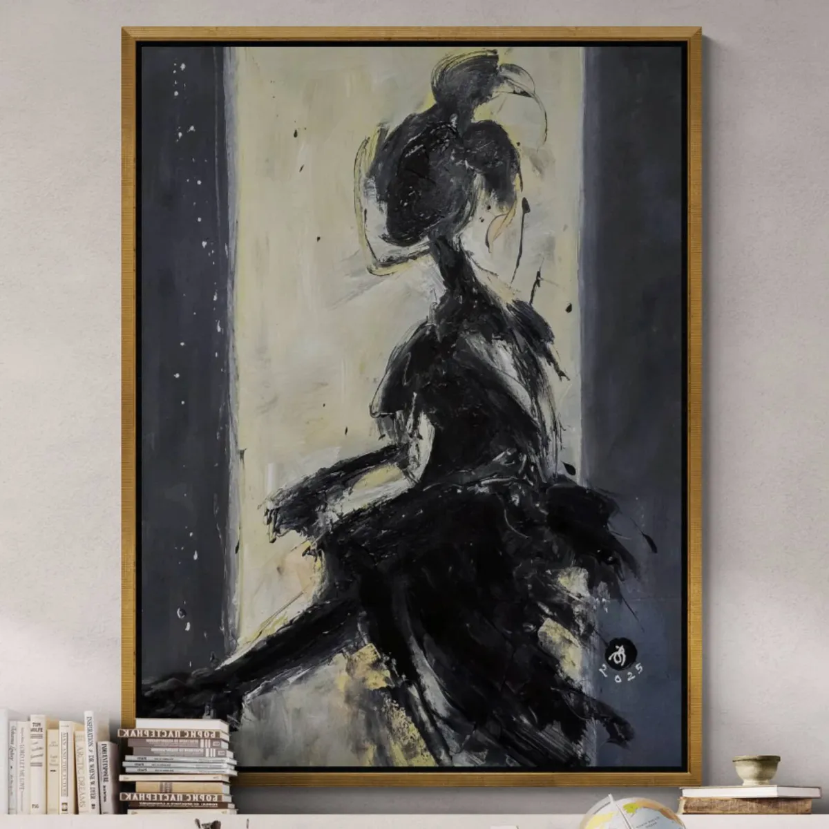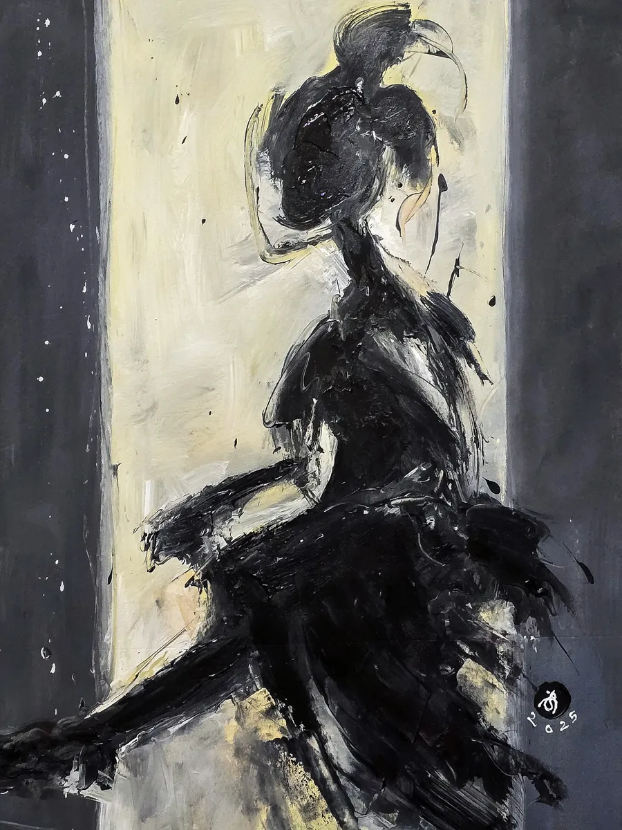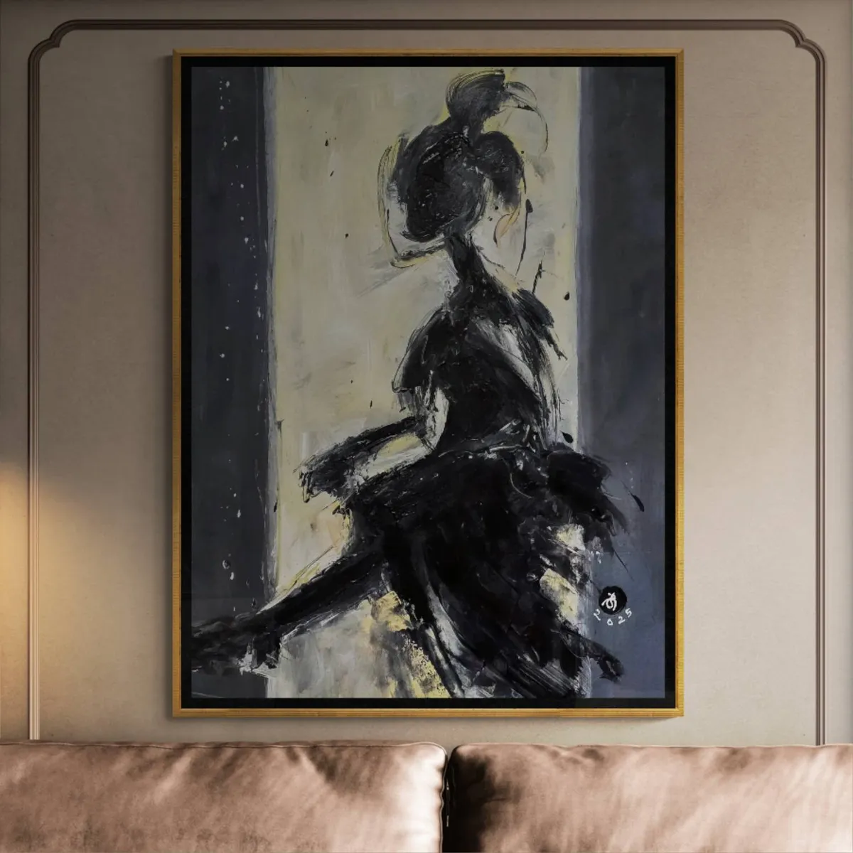 A bold, gestural interpretation of a single flower, where sweeping black strokes and textured layers rise against a golden field. The image balances between abstraction and suggestion, evoking both the fragility and resilience of nature. Each mark carries the energy of calligraphic movement, creating a composition that feels timeless and immediate. This work belongs to Retne’s series exploring expressive minimalism, where form emerges from the dialogue between gesture and space. To N-7 transforms the simplicity of a floral motif into a powerful contemporary statement. Signed on the front. On the back – titled, dated, and hand-signed by the artist. Certificate of Authenticity included and hand-signed – confirming originality and authorship. Technical Details Canvas size: 90×70 cm (5 cm margins for stretching) Recommended stretcher frame: 80×60 cm Medium: Acrylic and mixed media on canvas Finish: Sealed with UV Gloss Varnish (shiny finish) Canvas Edges & Composition 5 cm margins around the edges are painted to maintain full visual continuity when stretched. Strokes and textures wrap around the sides. Shipping & Packaging Courier Services: DPD, GLS, UPS, PostNL, FedEx, LP EXPRESS Packaging: Shipped rolled in a secure heavy-duty tube for safe international delivery Tracking: Provided Important: Please wait to order a stretcher frame until the artwork arrives to ensure precise fit.