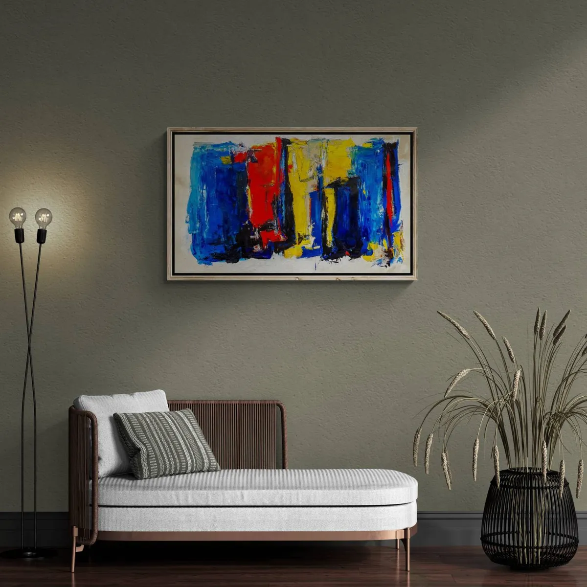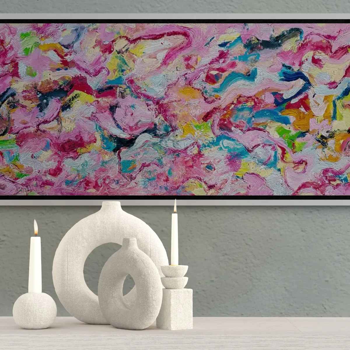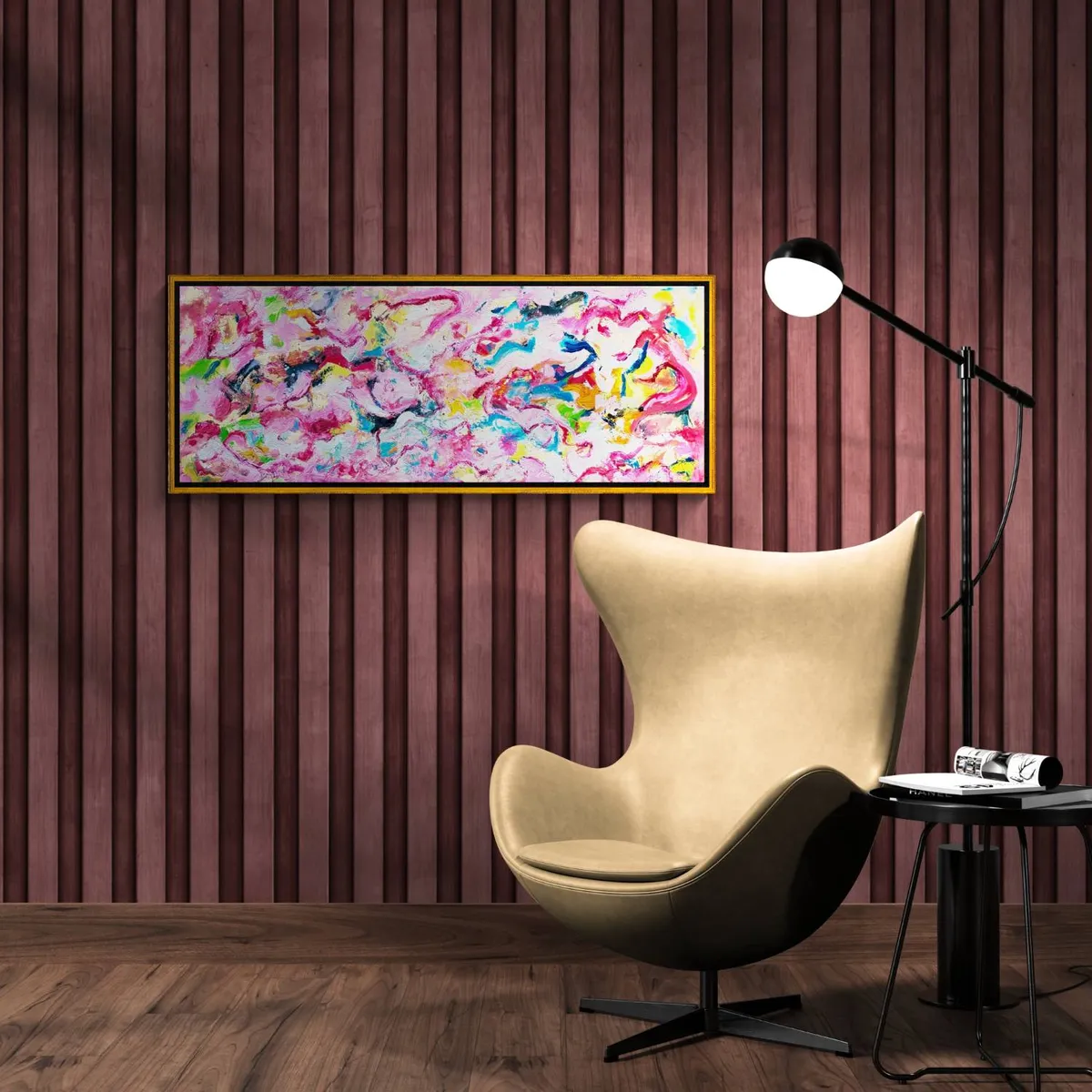 The modern look and visual depth of this bold colorful, textured piece create a strong emotional or expressive abstract in his unique style. *** The painting is 100% hand-painted using Oil paint, UV satin varnish on cotton canvas (360 g/m²) . *** The canvas has been stretched and mounted. The owner of this artwork will enjoy it right out of the box as it arrives READY TO HANG! *** Painting signed on the front. Date and signed on the back. All of the Retne artworks come with a signed certificate of authenticity. *** Images size: (H)43x(W)115x(D)2.5 cm.